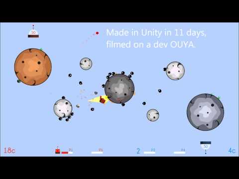 My game for CREATE is a dual stick run and jump shooter with planetoid gravity for 2-4 players where you run from hordes of monsters whilst attempting to destroy the enemy ship. I created this in Unity and there were some bugs concerning inputs from multiple controllers canceling each other out that I couldn't fix in time for submission... I'm fairly certain it's an issue in the current Unity package for OUYA, but it's pretty fun for two folks regardless. I left 4 player support in there even though I couldn't test it; hopefully that's functional enough to be fun, too!